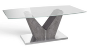 The Dolce Rectangle Dining Table and Coffee Table showcase a contemporary design that blends tempered glass, a concrete look foil wrapped leg, and stainless steel for a modern industrial feel. The clear glass top paired with the grey concrete effect base creates a stylish and on trend statement.